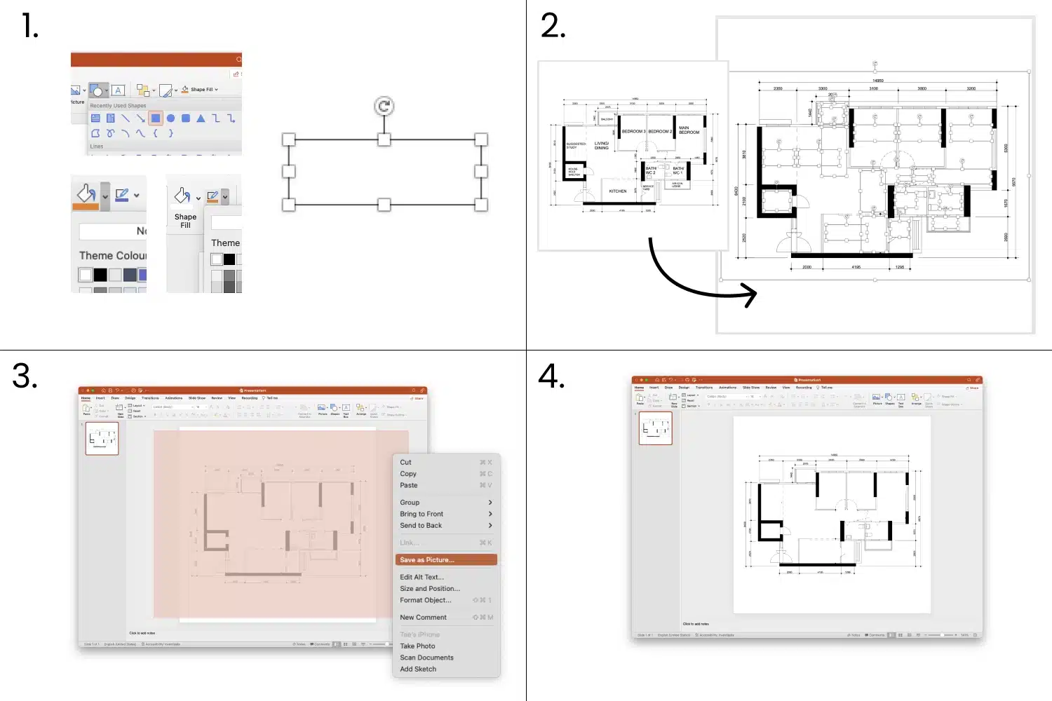 - Save as new image: Once you’ve covered the unwanted elements, save the floor plan along with the shapes as a new image file. Drag from the top right to bottom left to select all the white filled shapes and the floor plan on the Canvas. Right click and select Save as Picture…